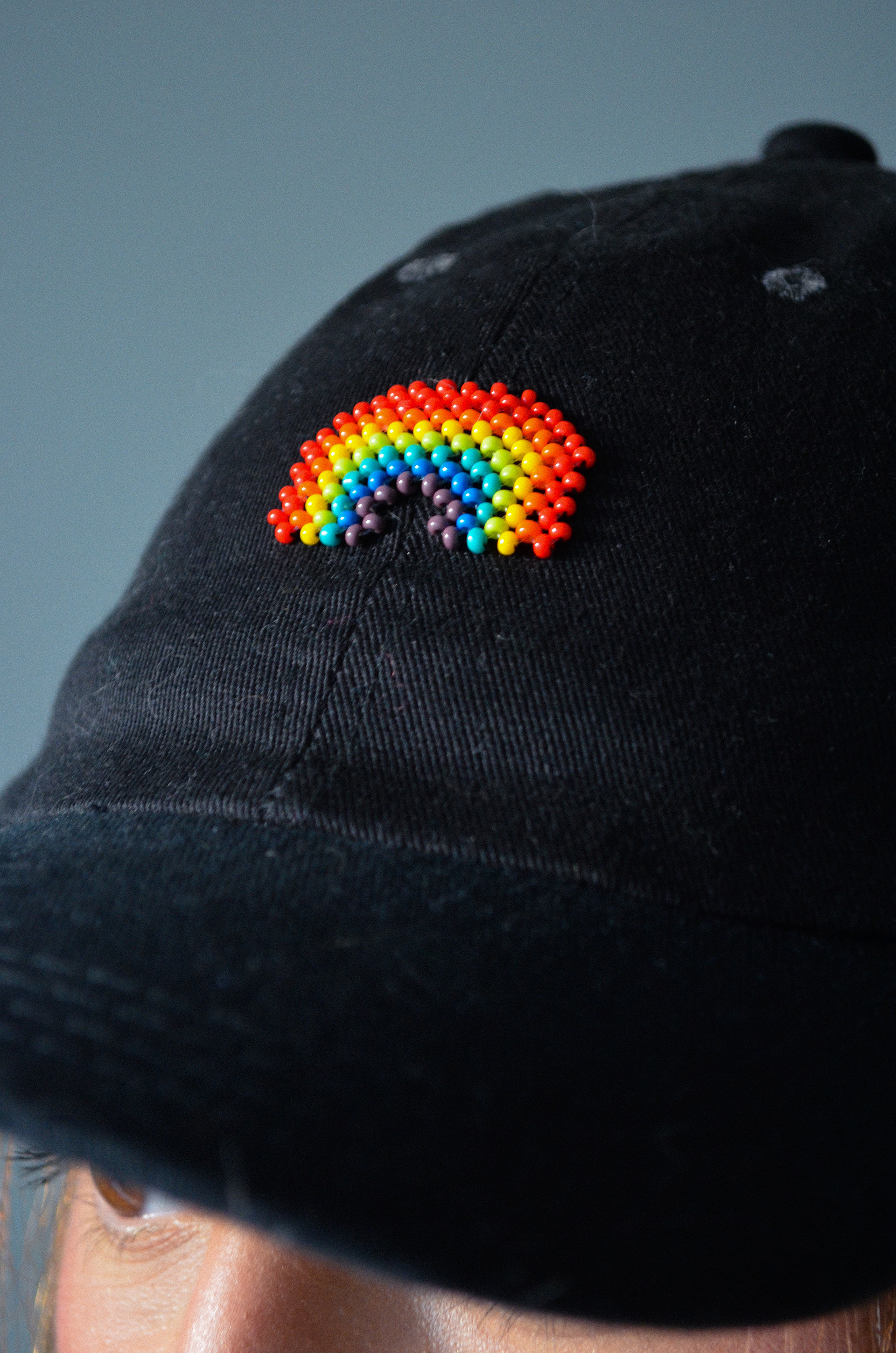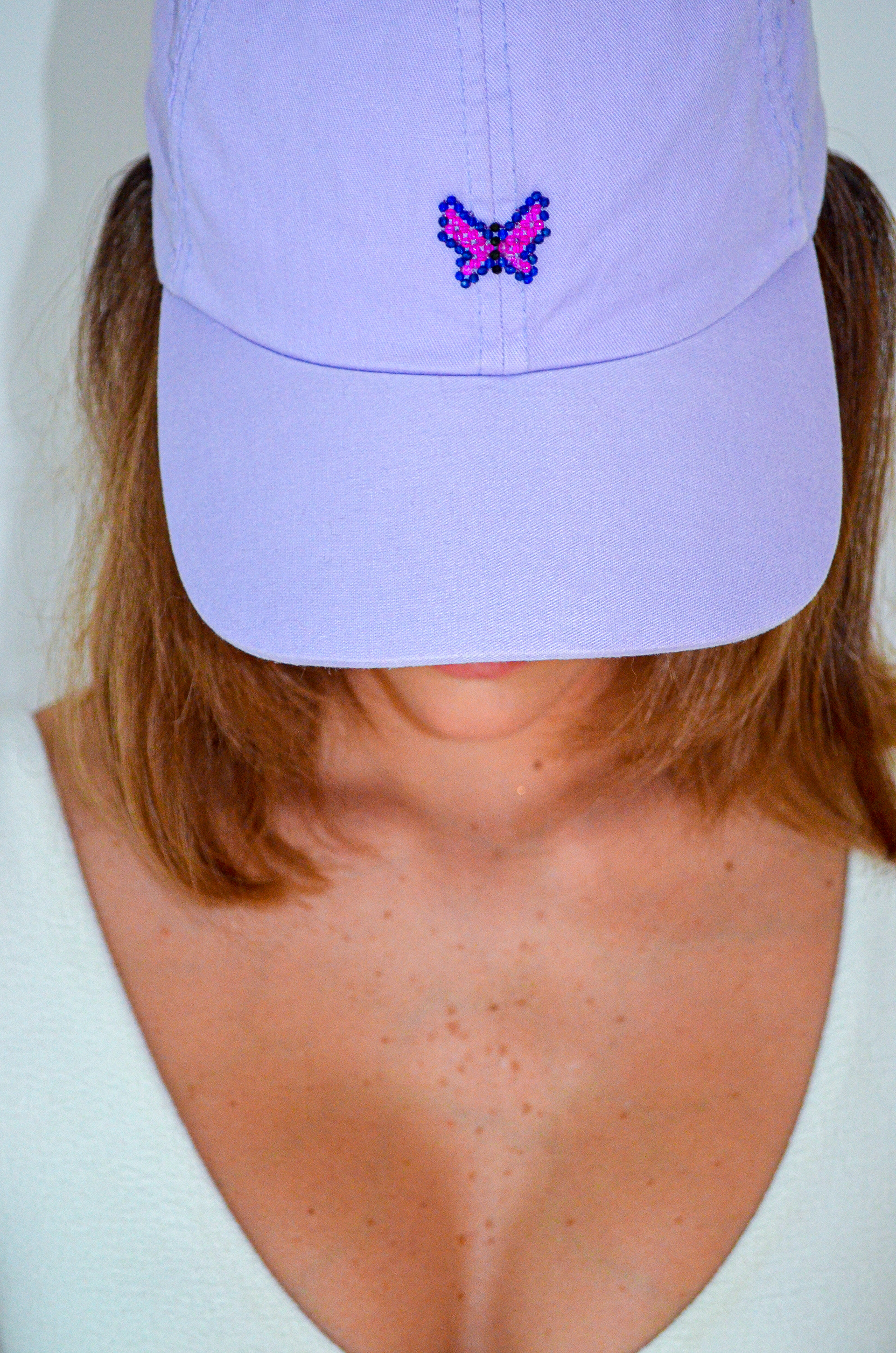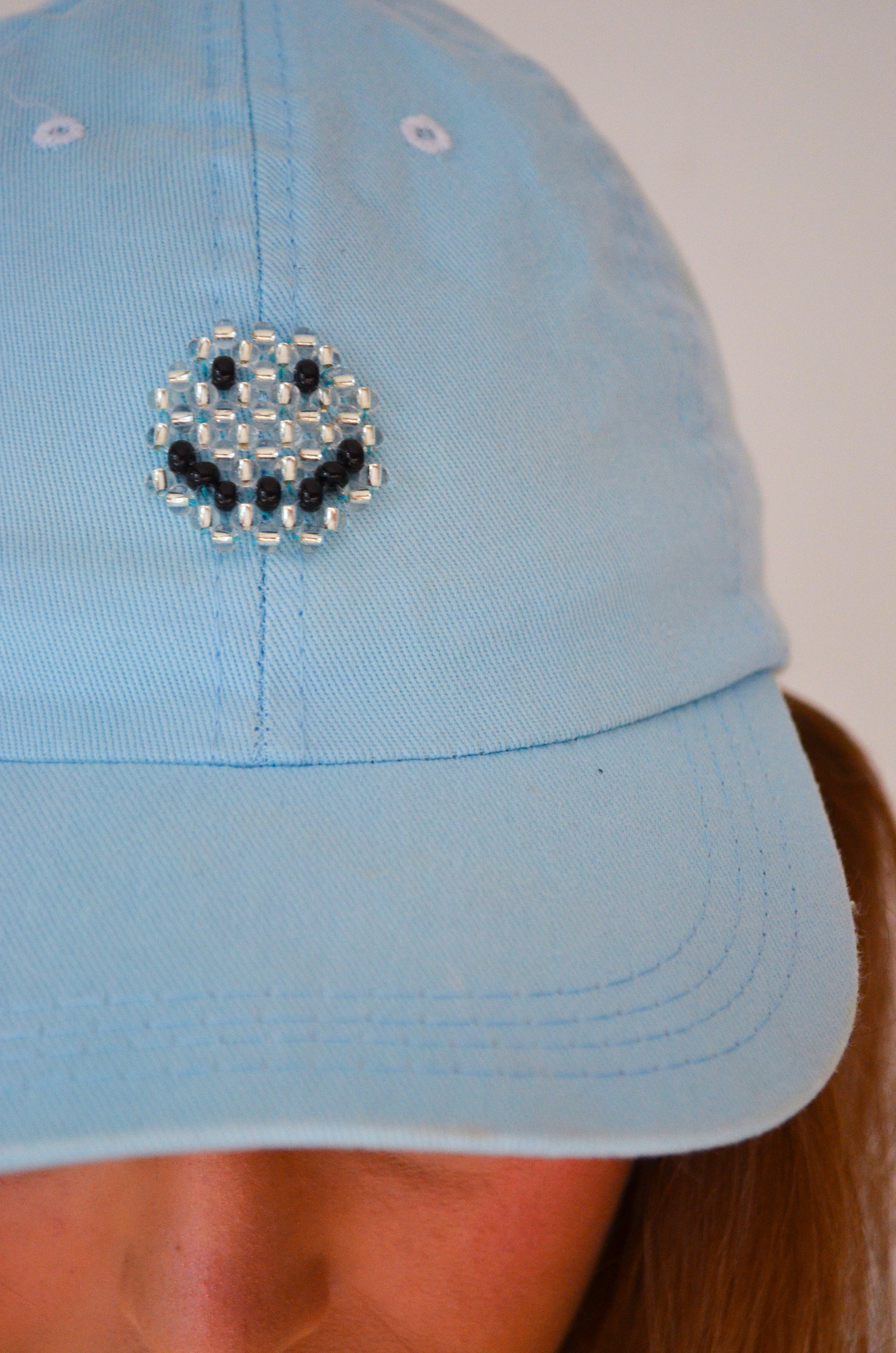 diferentes intervenções em miçangas e cristais em bonés lisos