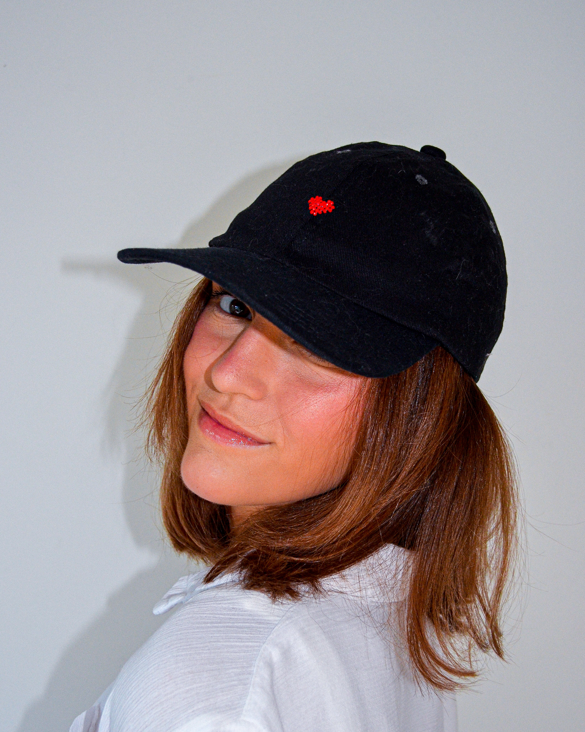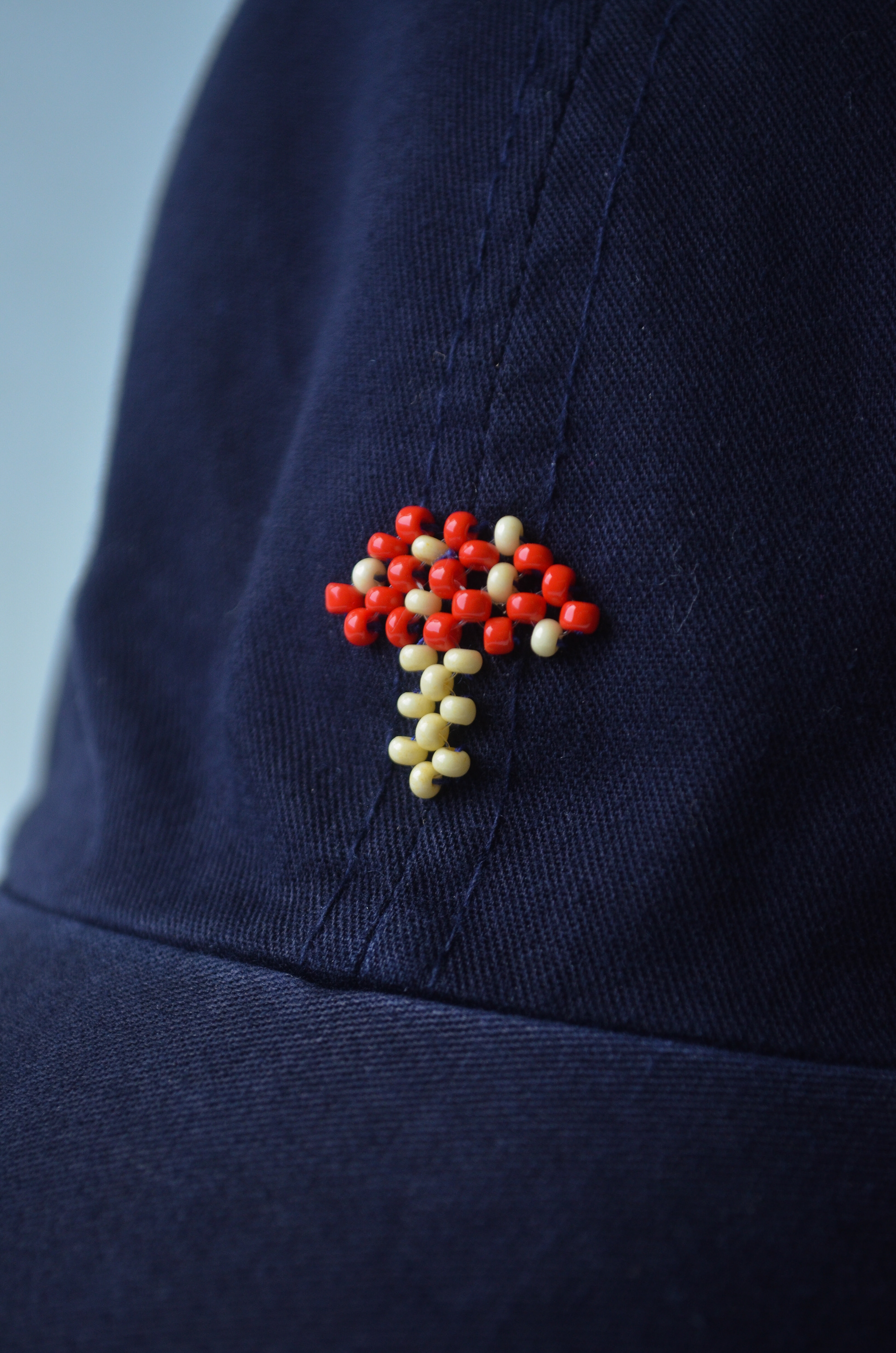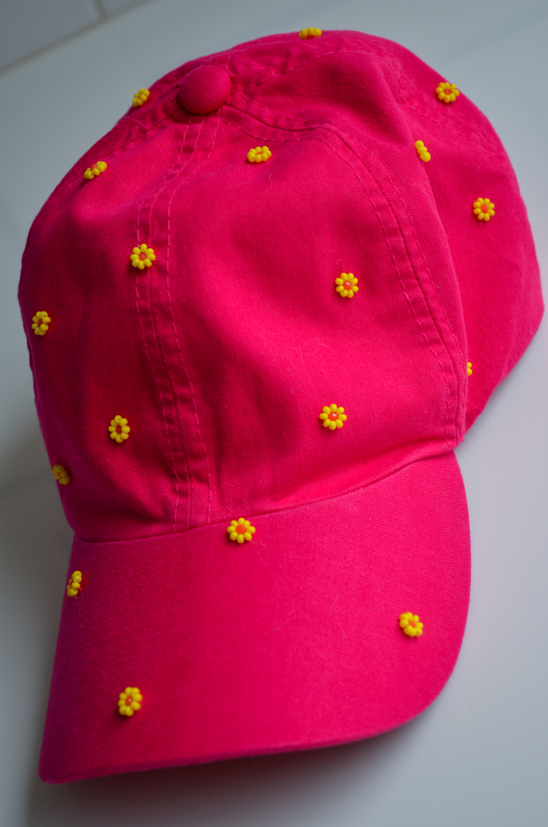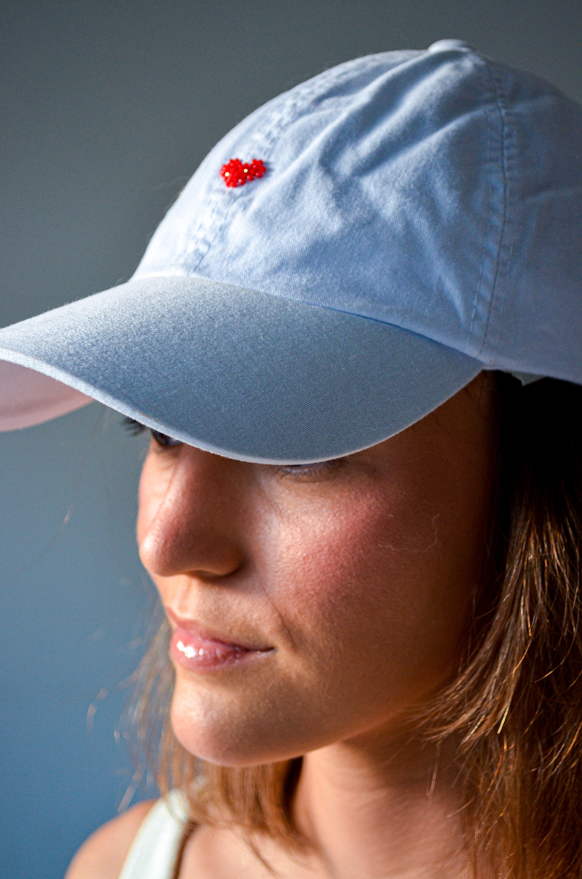 diferentes intervenções em miçangas e cristais em bonés lisos