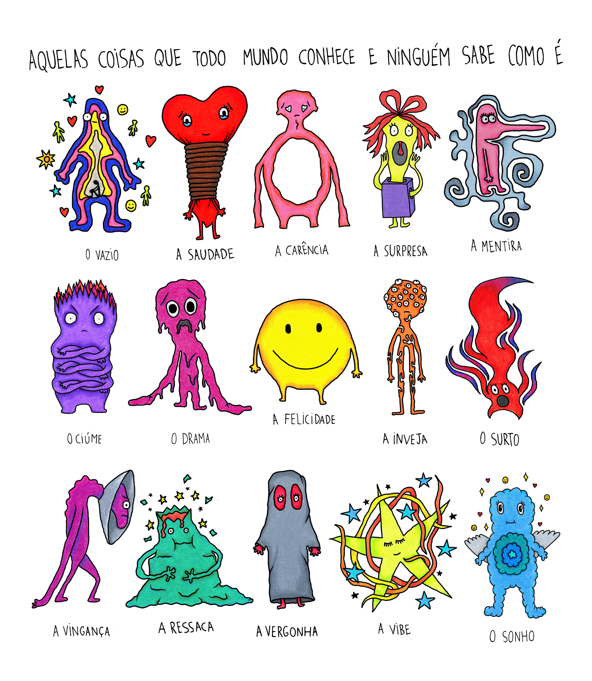 Conjunto de ilustrações inspiradas em sentimentos, momentos e sensações. Quis retratar de forma gráfica e lúdica aquelas "coisas" que, gostando ou não, todos nós convivemos regularmente. Uma forma de deixar mais leve sentimentos que fazem parte da vida e muitas vezes são difíceis de lidar.